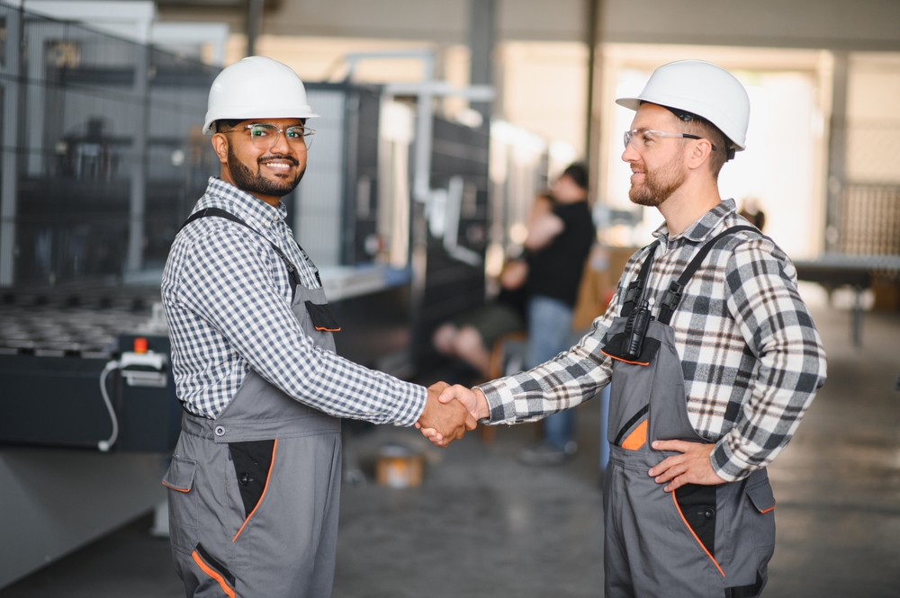 Two,Engineers,In,Hard,Hats,Shake,Hands,In,A,Factory